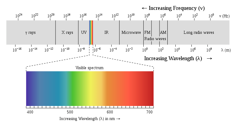 There is light we can see, also called white light, and light we cannot see, such as infrared, ultraviolet light, gamma rays, and x-rays. Altogether, visible and invisible light make up the electromagnetic spectrum. Different colors, or types, of light, travel at different frequencies, or wavelengths, as the image below demonstrates. Light with a longer wavelength or lower frequency, such as red, has less energy. Light with a shorter wavelength or higher frequency, such as violet, has more energy.